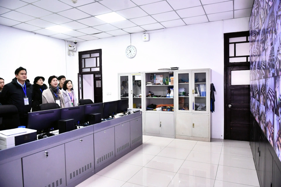 于吉红在中控室听取AI智能巡检系统汇报,通过监控大屏实时查看各考场整体情况,提出要依托系统实现异常行为智能识别与环境数据动态监测,确保考务指令一键直达、风险隐患即时处置,推动传统巡查向智慧化监管升级。