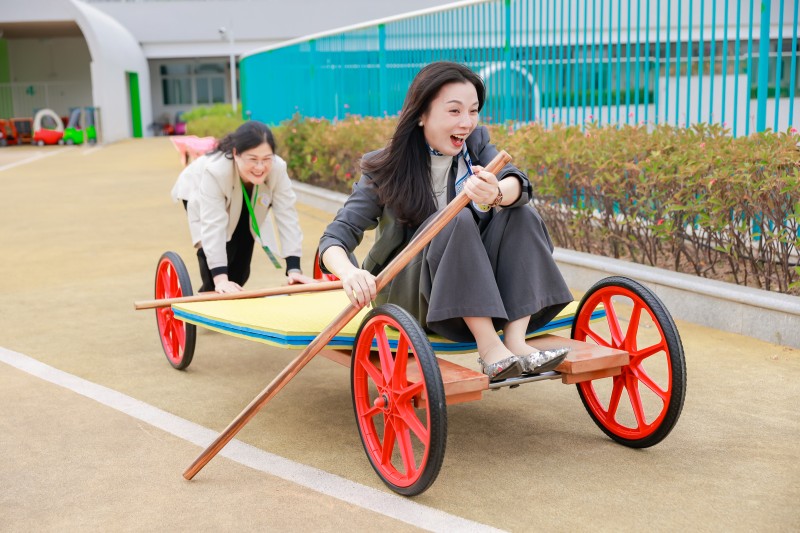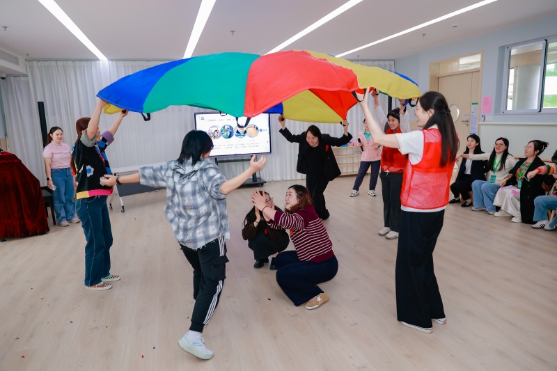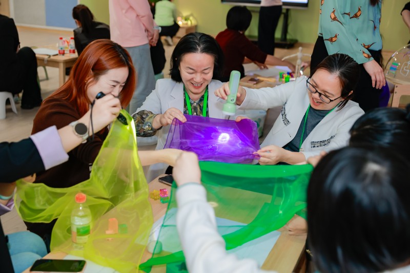 其中,“探秘大自然——生态科学教育工作坊”由未来一幼和珠海实幼负责,以“体验共创”为核心,不仅为生态科学教育提供了新思路,也有效激发了教师的教育创意,为后续科学教育实践注入了丰富灵感;“晶晶亮——幼儿视动整合游戏工作坊”由总部、校本部园、牡丹分园负责,在深度解读课程设计背景与教育逻辑基础上,让大家在趣味互动中体验视觉与动作如何密切配合,感悟视动整合游戏的教育价值;“跟着非遗玩起来——中华优秀传统文化教育工作坊”由望京分园和明光分部负责,通过了解以儿童为中心的传统文化教育研究成果,亲身体验漆画、扎染、京剧三大非遗项目,与会嘉宾在畅玩中理解中华优秀传统文化内涵,感受“儿童视角”下非遗教育的魅力;“探秘空中花园——幼儿自主游戏工作坊”由新校区园和龙樾分园负责,与会嘉宾通过自由探索“艺术长廊”“探险营”“探索角”三大游戏花园,在快乐的自主游戏中体验儿童在游戏中的情感与认知表达,并通过倾听与表征环节,进一步理解儿童行为背后的学习逻辑以及自主游戏与倾听对儿童发展的价值;“用音乐唤醒感官——托班音乐游戏工作坊”由珠海实幼负责,在详细阐释音乐与感官发展内在联系基础上,带领与会嘉宾亲身体验《描声舞》等音乐游戏,通过节奏律动与小组创编,深化对听觉、触觉等多感官协调发展的理解。