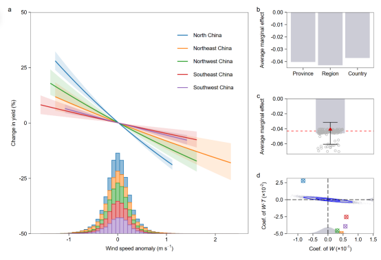 风速是影响植物生长的重要环境因子。它可直接调节气孔导度、改变叶片姿态、影响冠层光截获,进而调控光合作用与蒸腾作用等关键生理过程。此外,风常与其他环境因素互作影响蒸散发,从而改变植物生长的水热条件。在特定情况下,风可能引发土壤侵蚀与养分流失,或导致叶片撕裂、茎秆倒伏等直接机械损伤。生态系统尺度的研究已揭示风速变化对植被的大范围影响,田块及作物尺度的研究也积累了风影响作物生长与产量形成的证据。然而,在宏观时空尺度上,风对作物的影响仍有待进一步阐明。
