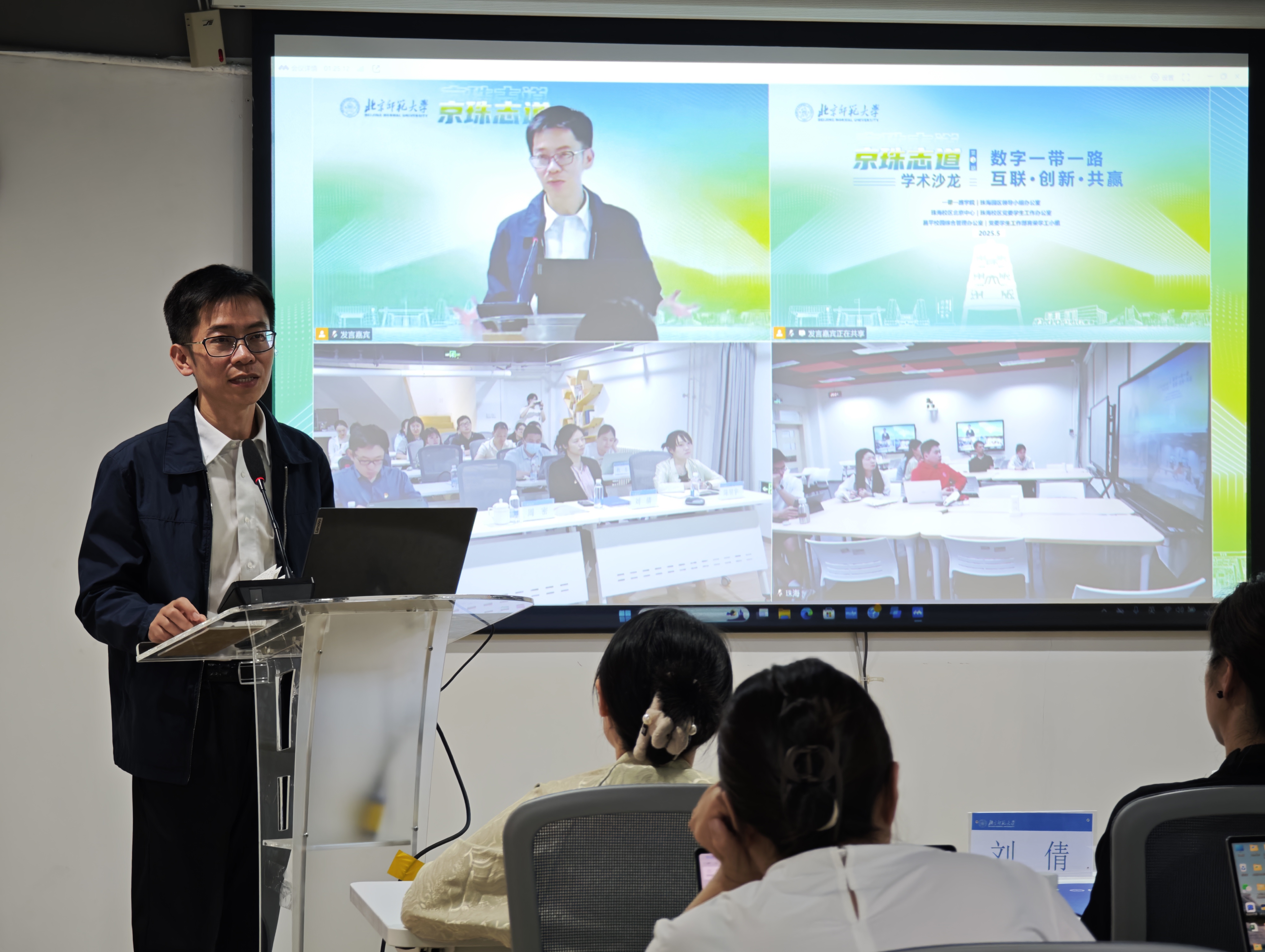 为引导师生深刻理解共建“一带一路”的重大意义、以数字技术赋能“一带一路”高质量发展的时代价值,积极探索数字技术与人工智能赋能教育的新思路,5月26日,“京珠志道”学术沙龙第三期活动以“数字‘一带一路’:互联·创新·共赢”为主题,特邀商务部国际贸易经济合作研究院美洲与大洋洲研究所副所长周密、北京师范大学一带一路学院副院长刘倩作主题报告。报告会由一带一路学院、珠海园区领导小组办公室、珠海校区北京中心、珠海校区党委学生工作办公室联合主办,分别在北京校区海淀校园、珠海校区励耘楼设置会场并视频连线,两校区共30余名师生参加活动。