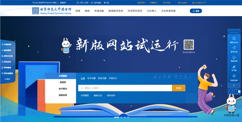资源支撑方面,北师大图书馆致力于打造全域、智慧、高效的阅读资源服务体系。持续丰富馆藏纸质图书,大力推进数字资源平台建设。开发新版智慧门户,利用数据中台实现阅读数据实时交互。打造学术成果库,优化升级“教材教参库”等特色自建数据库,为系统性、前沿性专业阅读提供坚实支撑。开展线上线下“闪借”服务,极大拓展阅读的时空边界与资源获取效率,以主动、精准的服务姿态体现阅读育人温度。