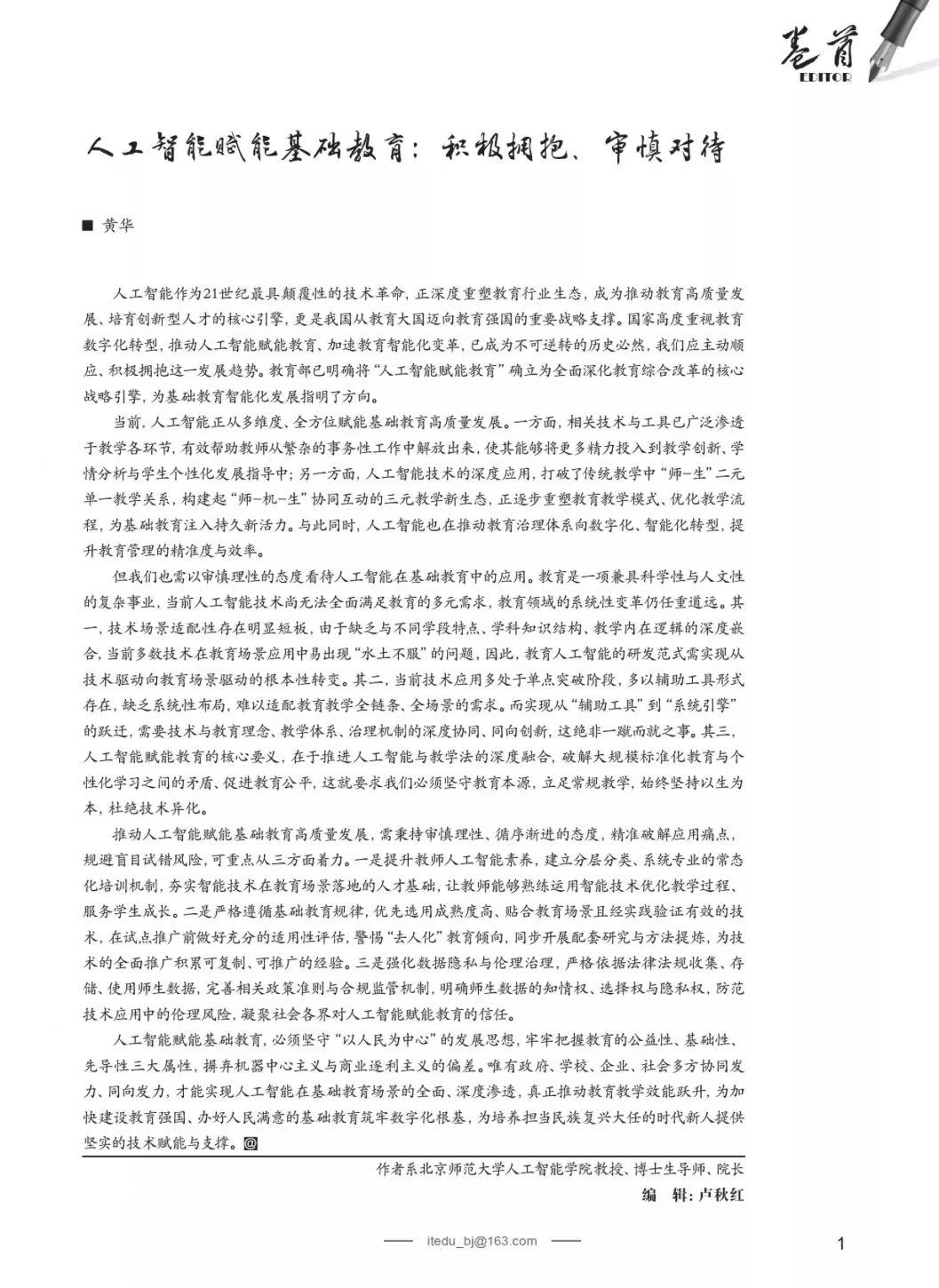 原文刊于《中小学信息技术教育》2026年第04期卷首文。作者黄华,系北京师范大学人工智能学院院长。