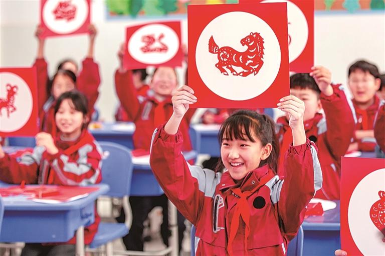 而在北京医科大学附属小学的美术教室里,从憨态可掬的小动物,到纹样精巧、寓意吉祥的窗花,不同年级的剪纸作品错落陈列。四年级的刘子涵托起刚剪好的纸蝴蝶,翅膀毛边还没修齐,眼里已漾满得意:“太神奇了!三剪刀就能变出蝴蝶!”