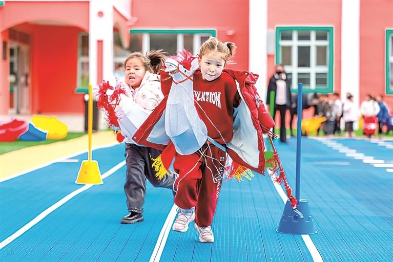 新疆伊犁巩留县库尔德宁镇中心幼儿园的孩子们运用“马灯舞”器材开展活动