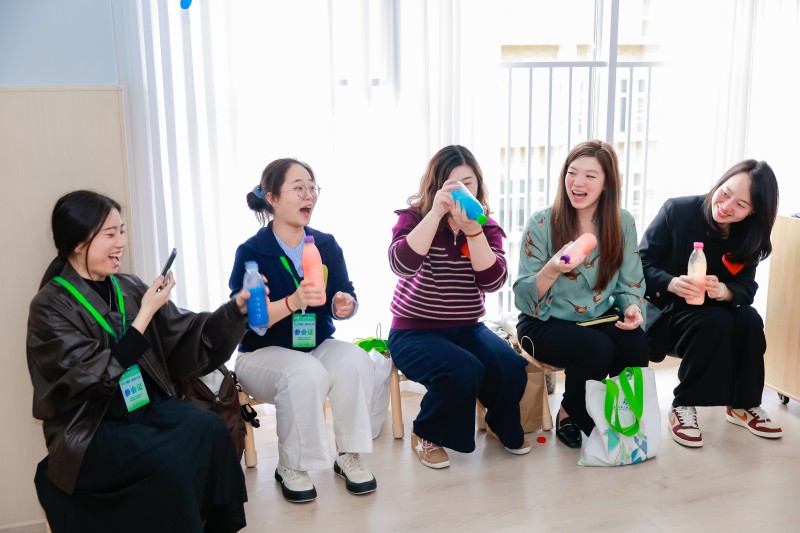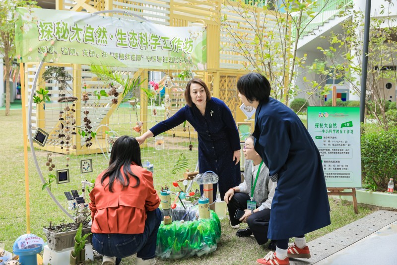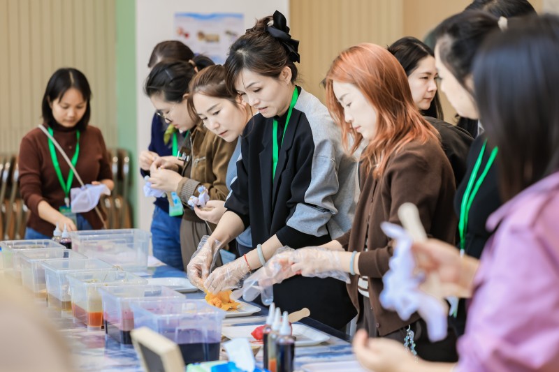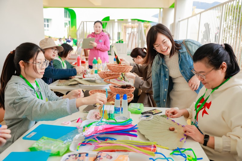 其中,“探秘大自然——生态科学教育工作坊”由未来一幼和珠海实幼负责,以“体验共创”为核心,不仅为生态科学教育提供了新思路,也有效激发了教师的教育创意,为后续科学教育实践注入了丰富灵感;“晶晶亮——幼儿视动整合游戏工作坊”由总部、校本部园、牡丹分园负责,在深度解读课程设计背景与教育逻辑基础上,让大家在趣味互动中体验视觉与动作如何密切配合,感悟视动整合游戏的教育价值;“跟着非遗玩起来——中华优秀传统文化教育工作坊”由望京分园和明光分部负责,通过了解以儿童为中心的传统文化教育研究成果,亲身体验漆画、扎染、京剧三大非遗项目,与会嘉宾在畅玩中理解中华优秀传统文化内涵,感受“儿童视角”下非遗教育的魅力;“探秘空中花园——幼儿自主游戏工作坊”由新校区园和龙樾分园负责,与会嘉宾通过自由探索“艺术长廊”“探险营”“探索角”三大游戏花园,在快乐的自主游戏中体验儿童在游戏中的情感与认知表达,并通过倾听与表征环节,进一步理解儿童行为背后的学习逻辑以及自主游戏与倾听对儿童发展的价值;“用音乐唤醒感官——托班音乐游戏工作坊”由珠海实幼负责,在详细阐释音乐与感官发展内在联系基础上,带领与会嘉宾亲身体验《描声舞》等音乐游戏,通过节奏律动与小组创编,深化对听觉、触觉等多感官协调发展的理解。