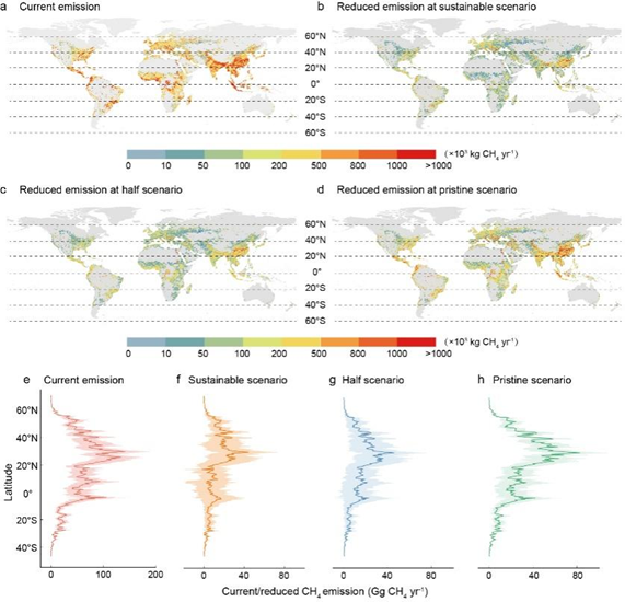 研究团队进一步建立综合水环境变量和陆面环境指标的机器学习模型,估算全球营养盐富集河流CH4排放量为9.7 Tg CH4 yr-1,占全球河流CH4排放的35%。在此基础上,研究设定了三种营养盐削减情景:实现可持续发展目标(SDGs)、营养盐浓度减半、以及恢复至未受干扰水平。结果表明,通过营养盐削减可实现2.2-4.7 Tg CH4 yr-1的减排量,占全球营养盐富集河流总排放量的22%-49%(图2)。
