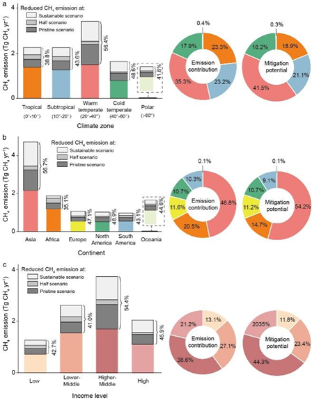 图3 不同纬度带、大洲及发展水平地区河流CH4排放量及减排潜力