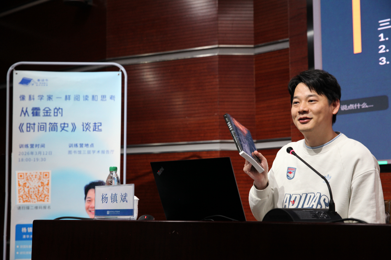 3月12日,图书馆“阅读能力提升训练营”第十一期线下活动在图书馆三层学术报告厅举办。本期训练营邀请清华大学高等研究院研究员杨镇斌作主题为“像科学家一样阅读和思考:从霍金的《时间简史》谈起”讲座,来自北京师范大学京珠两校区以及“强师工程”对口支援学校的200余名师生通过线上与线下方式参加活动。