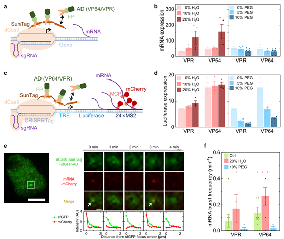 图3. 渗透压通过改变核内拥挤度及动力学,进而调控DNA标记和基因转录
