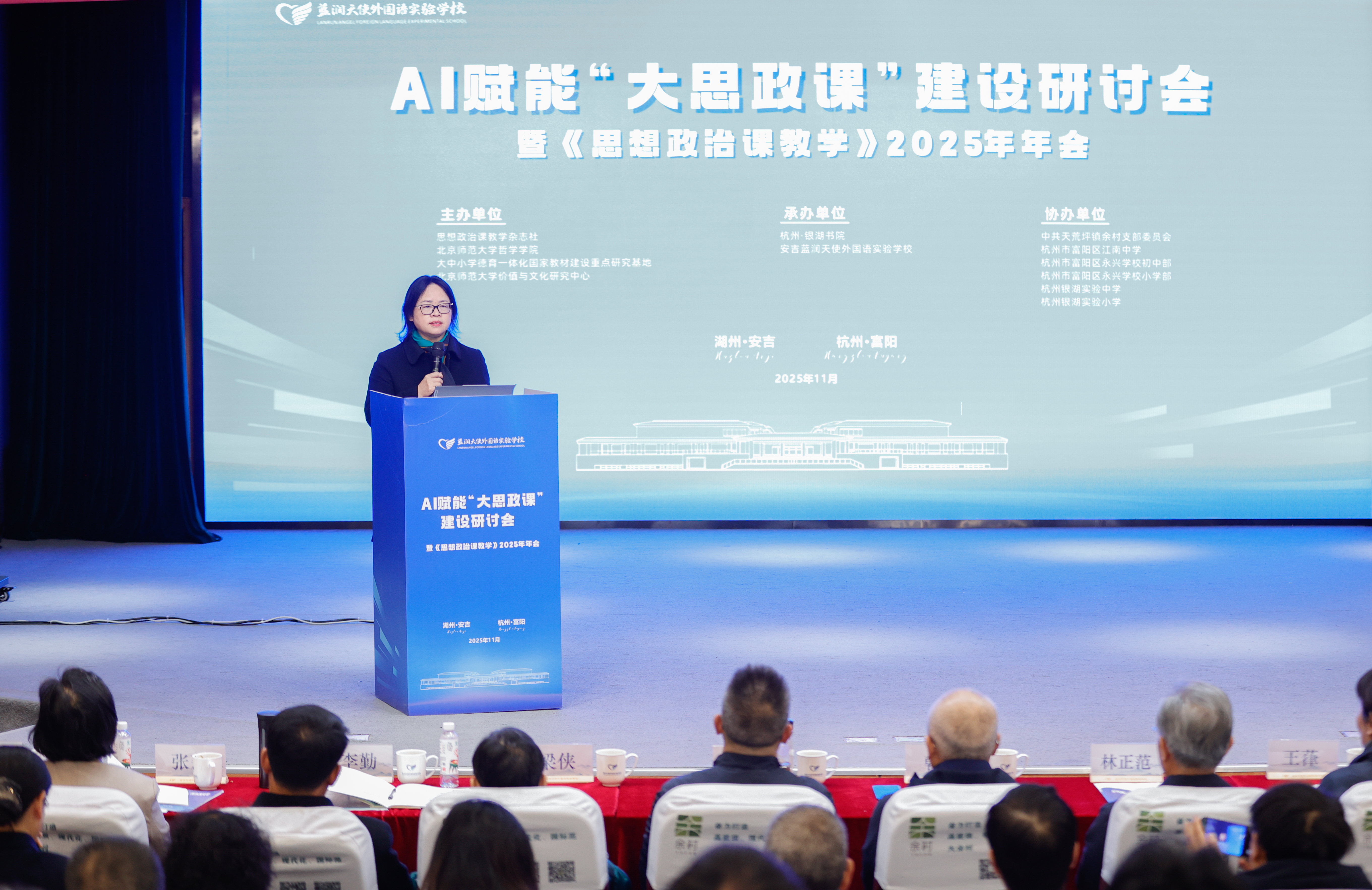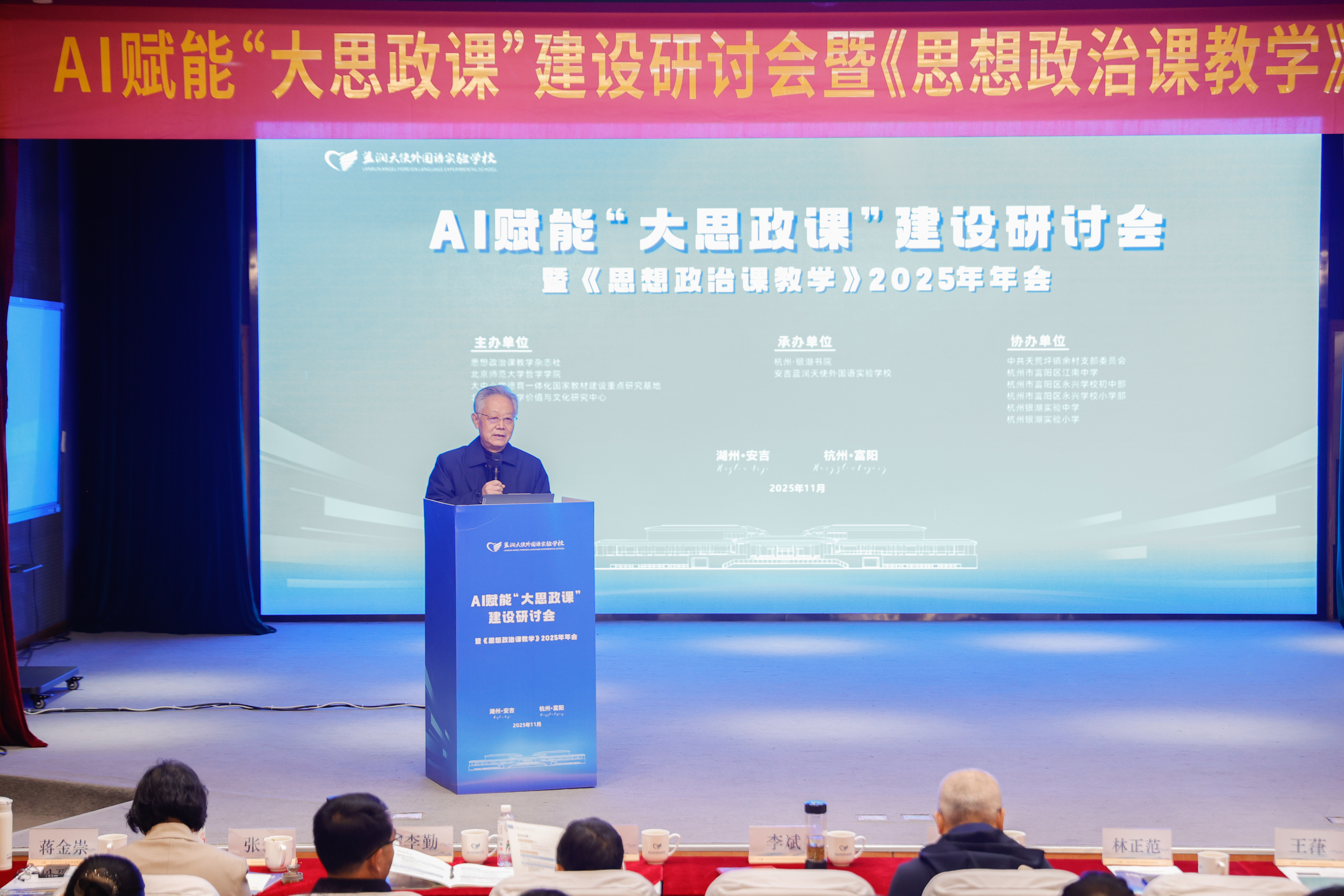 为深入贯彻党的二十届三中、四中全会和全国教育大会精神,全面落实《教育强国建设规划纲要(2024-2035年)》和教育部等十部门印发的《全面推进“大思政课”建设的工作方案》以及《国务院关于深入实施“人工智能+”行动的意见》,纪念“两山”理念提出二十周年,11月28日至29日,AI赋能“大思政课”建设研讨会暨《思想政治课教学》2025年年会在浙江省杭州市和湖州市举办。本次会议由思想政治课教学杂志社、北京师范大学哲学学院、大中小学德育一体化国家教材建设重点研究基地、北京师范大学价值与文化研究中心主办,杭州银湖书院、安吉蓝润天使外国语实验学校承办,近百位来自全国各地的专家学者、思政教育工作者参加。