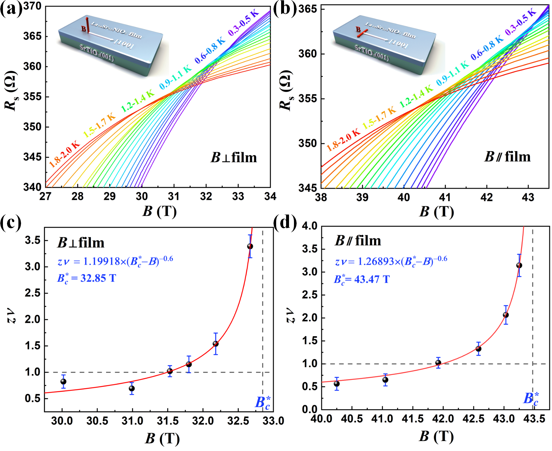 图2 | (a)垂直和(b)面内磁场下方块电阻Rs与磁场B的关系曲线。(c)垂直和(d)面内磁场下,有限尺寸标度分析给出的临界指数zν。红色实线为基于激活标度定律的拟合曲线,水平的虚线表示zν=1。
