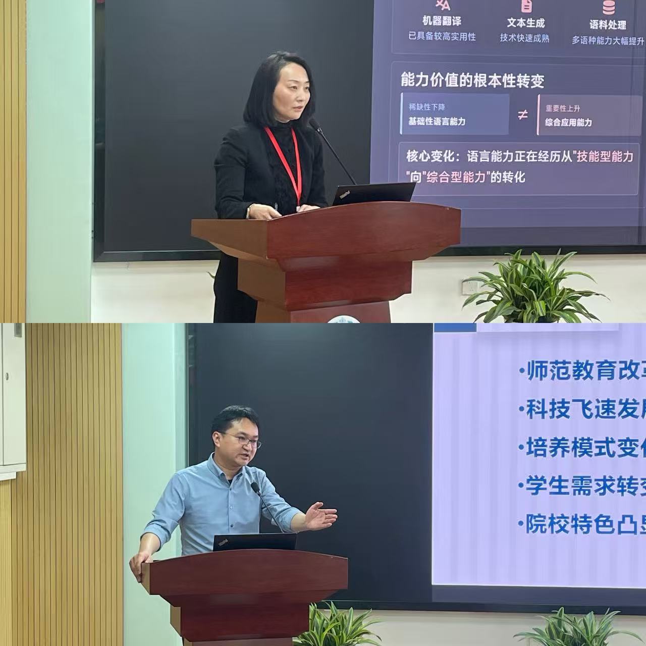 对外经济贸易大学外语学院院长李运博作题为“守正创新:面向新时代的校本《培养方案》的优化与课程重构”的报告,从顶层设计阐述培养方案修订与课程重构原则。报告以“通识为基、专业为本、数智赋能、实践创新”为指导,推动“外语+专业”与“AI+教育”融合,通过“平台+模块”课程体系实现从“技能本位”向“复合融通”转型,并提出基础阶段强化通识教育、高年级推进跨学科融合与弹性培养等举措。