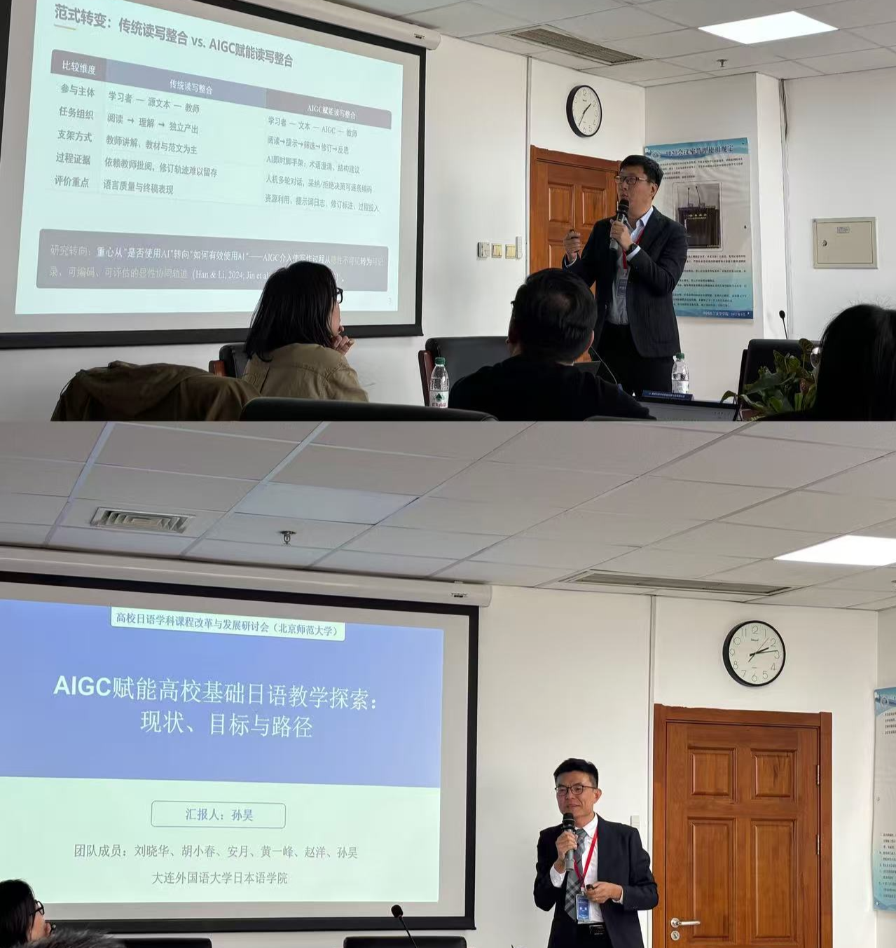 下午,教授葛睿、孙成志、刘克华、王楠,副教授刘伟、胡琪、张林,博士孙昊共八位主题发言人作精彩报告,金蕾、白蕊、张丽、张佳梅、霍沁宇、张晓东、范宽、张三妮、赵东茜、辛英花等10位一线教师做经验分享。大家分别围绕“培养目标引领下的核心课程体系、模块化课程的重构”“外语+模式下跨学科能力的融合机制与实现路径”“技术赋能与教学范式转型——AIGC在高校日语教学中的融合”“校本化教学资源与教材体系建设”四个专题展开深入交流与热烈讨论,头脑风暴不断、思想交锋频频,现场学术氛围浓厚,内容充实而富有启发性。