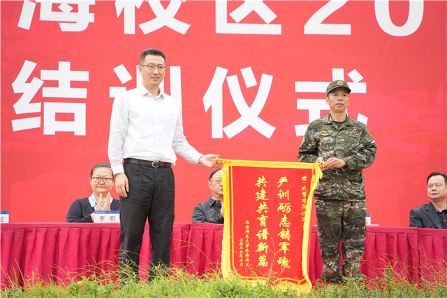 北京师范大学珠海校区党委副书记韩舰代表学校向承训部队赠送锦旗。