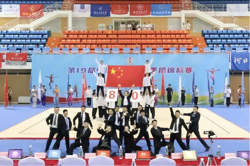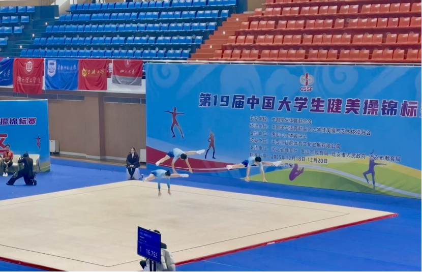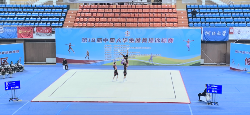 在高水平组有氧舞蹈项目比赛中,北京师范大学8名队员以16.100分的全场最高分夺冠。其中,盛思颖摘得有氧踏板金牌,李立浩再夺男子单人操冠军。