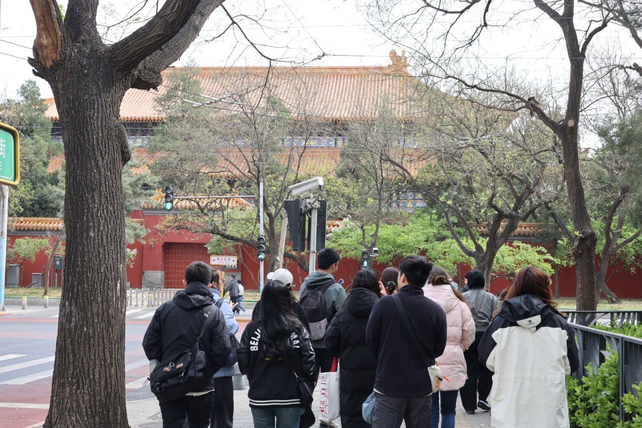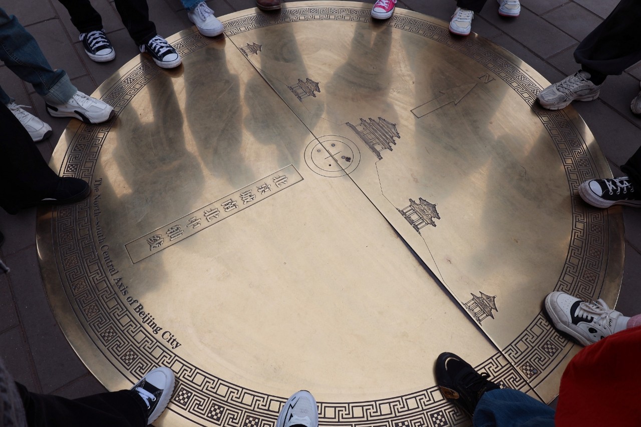 “北京中轴线”共包含15处遗产构成要素。4月13日下午,学生们从中轴线北端的钟鼓楼出发,向南经万宁桥,登景山,绕故宫,穿天安门广场及建筑群,行至正阳门,用脚步丈量中轴线上的遗产点。沿途经过南锣鼓巷街区、烟袋斜街、米粮库胡同、黄化门、地安门市场等北京胡同及街区,所到之处让同学们不仅对北京城历史规划及现代布局开展深度学习,还从更多维度了解到北京“中和”之美、“秩序”之美以及“日常”之美。