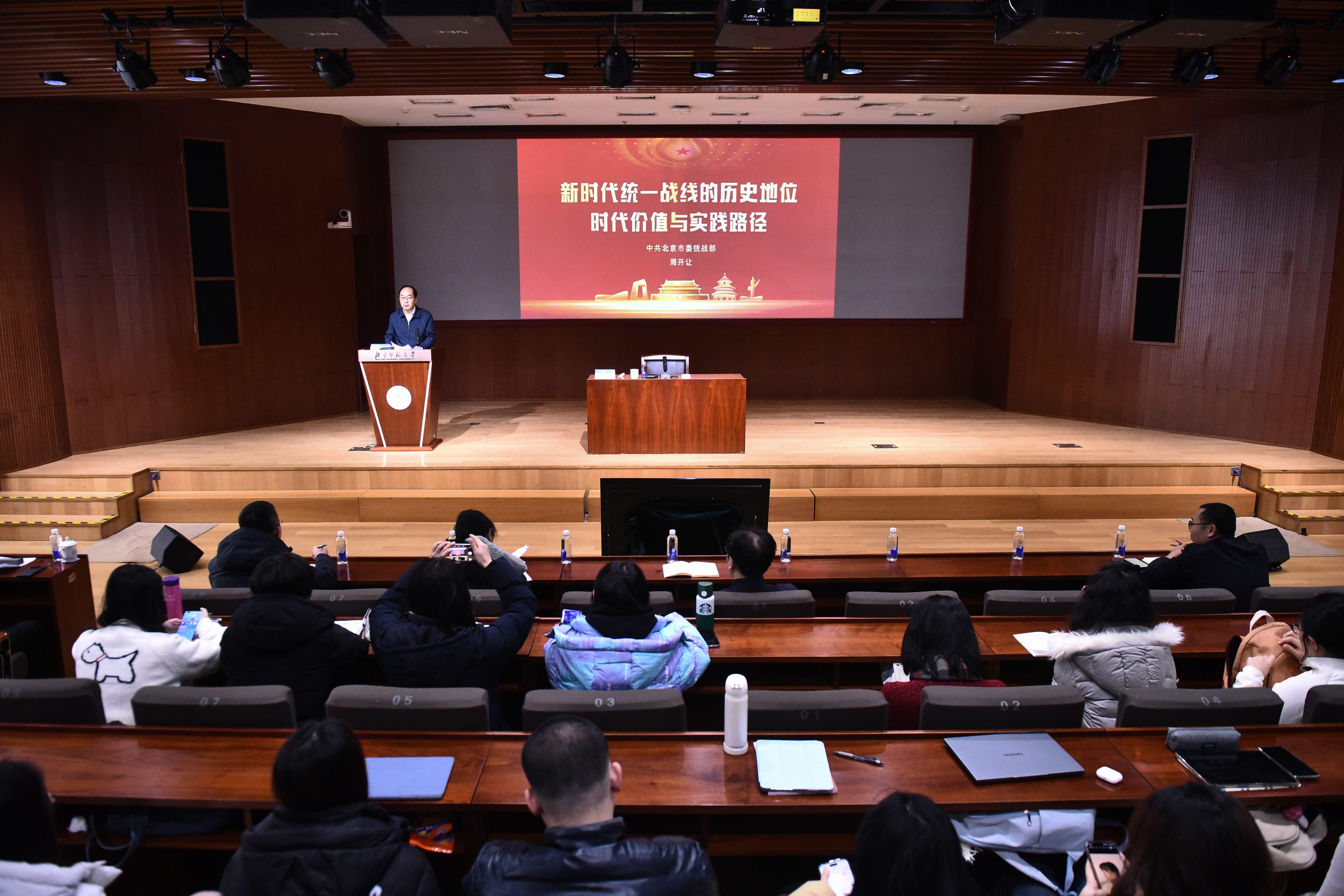 周开让以“新时代统一战线的历史地位、时代价值与实践路径”为题作专题讲授。他从深入学习贯彻习近平总书记关于做好新时代党的统一战线工作的重要思想切入,立足首都发展实践,系统阐释了新时代统一战线的历史地位、形势任务、工作规律与实践方向。他重点从“统一战线的历史地位更加重要”“统一战线面临的形势任务更加复杂”“对统战工作的规律性认识更加深入”“大统战工作格局的构建更加完善”“统战工作责任体系更加健全”五个方面进行了深入阐述。他强调,高校是统战工作的重要阵地。北京师范大学与统一战线有着深厚渊源,近年来学校统战工作体制机制不断完善,“同舟”讲堂等品牌活动影响力持续增强,民族团结教育扎实推进,相关工作成为首都高校统战工作的生动缩影。北京高校系统近年来通过完善政策体系、健全领导机制,有力提升了统战工作整体水平。