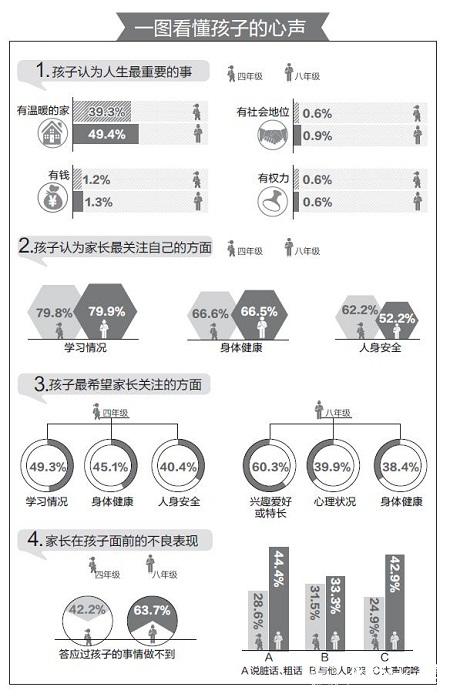 调查结果表明,与金钱、权力、社会地位等相比,孩子们更看重家庭带来的幸福感和满足感。温暖的家代表了和谐亲密的家庭关系、充足有力的家庭支持、接纳互信的家庭氛围,它是幸福的重要组成部分。温暖和谐的家庭对孩子身心成长都有重要的作用。研究表明父母温暖的教养方式能减少孩子的孤独感、焦虑等消极情绪,父母温暖的情感能促进孩子合作、感恩、负责任等积极社会品质的发展。