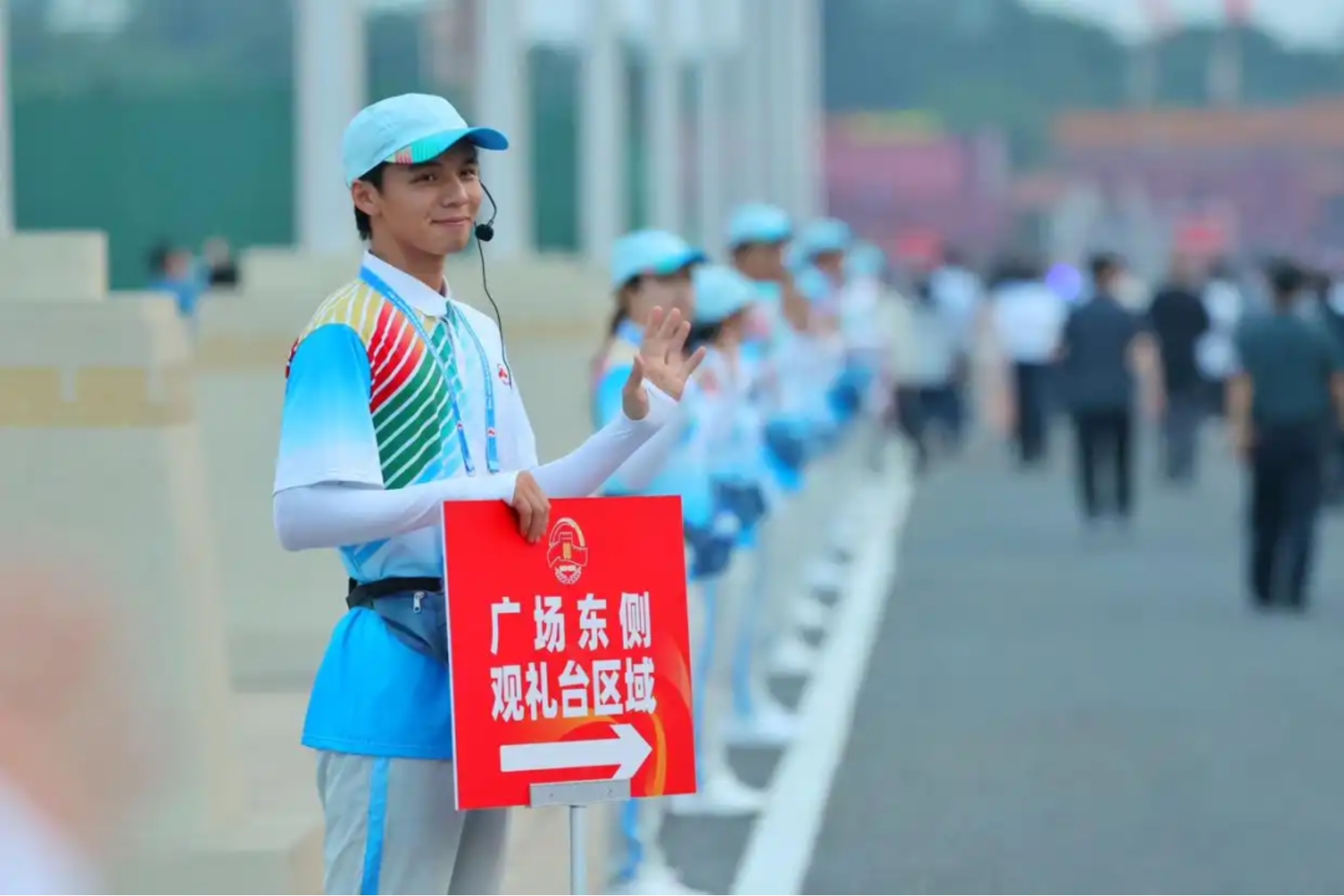 在中国人民抗日战争暨世界反法西斯战争胜利80周年纪念活动中,来自首都30多所高校的师生志愿者甘作“螺丝钉”,在纪念活动的重要点位,提供及时、周到的志愿服务,展现首都北京、当代中国的良好形象。