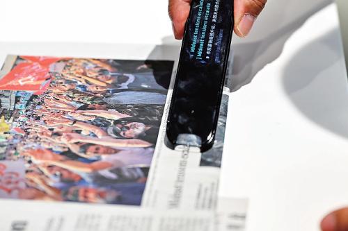 安徽合肥,观众在人工智能体验馆体验一款翻译词典笔。新华社发