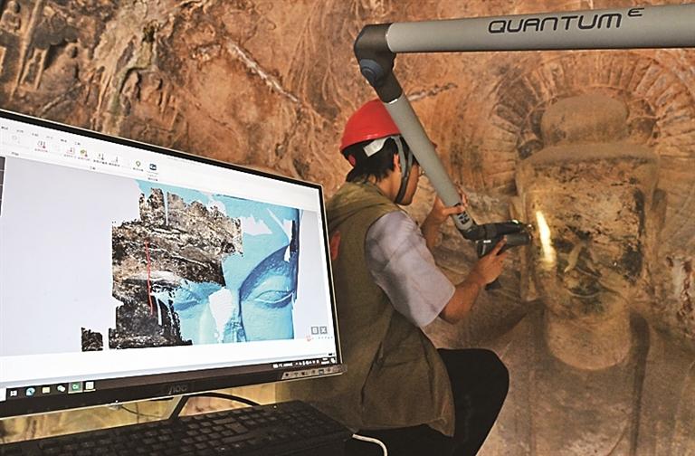 河南洛阳龙门石窟,科研人员用关节臂扫描仪扫描数据。新华社发