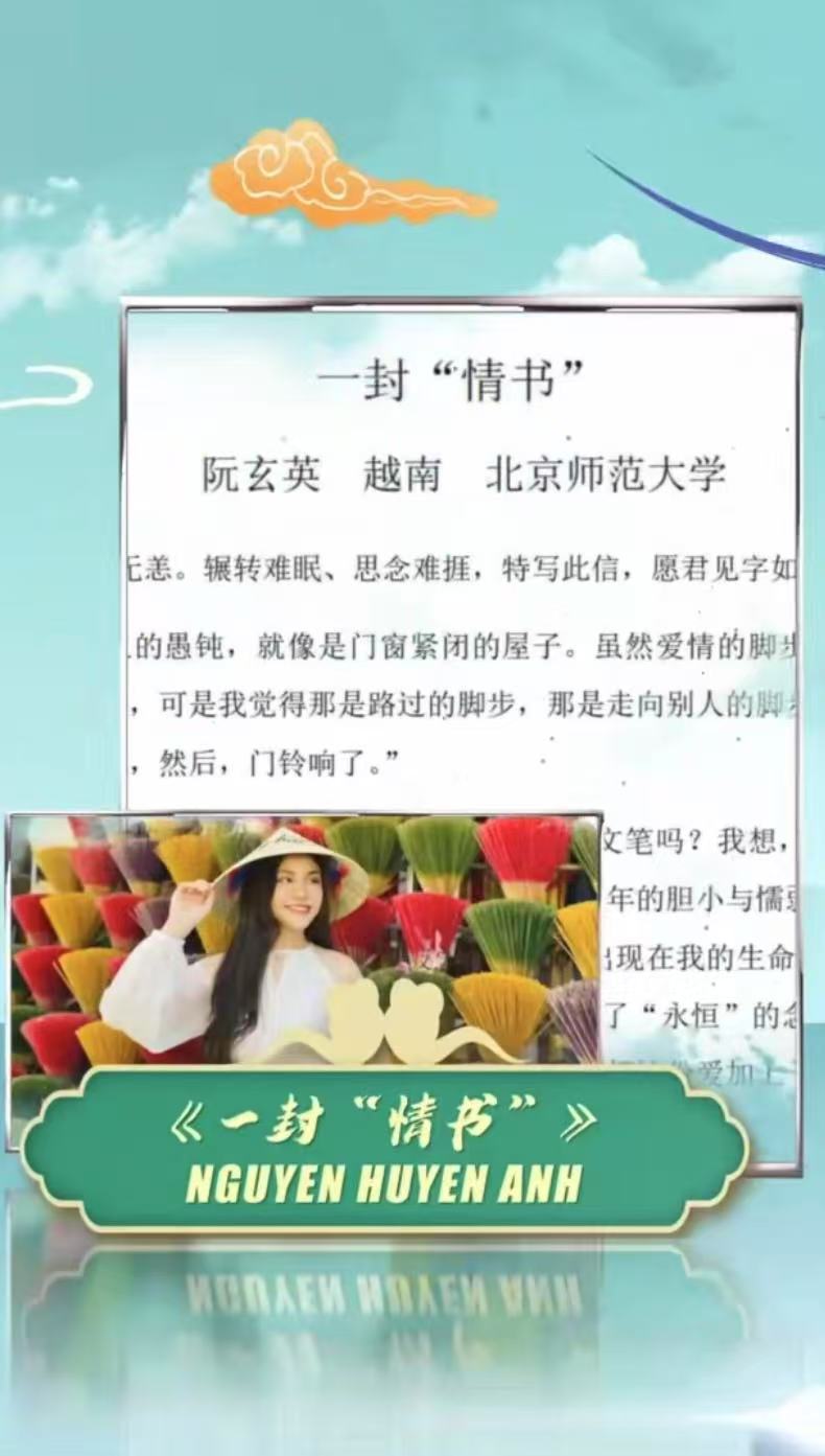 阮玄英轻轻地读起她写给中华文化的《一封情书》,这封书信荣获了中国教育部留学服务中心第八届“我与中国美丽邂逅”来华留学生征文大赛的一等奖。