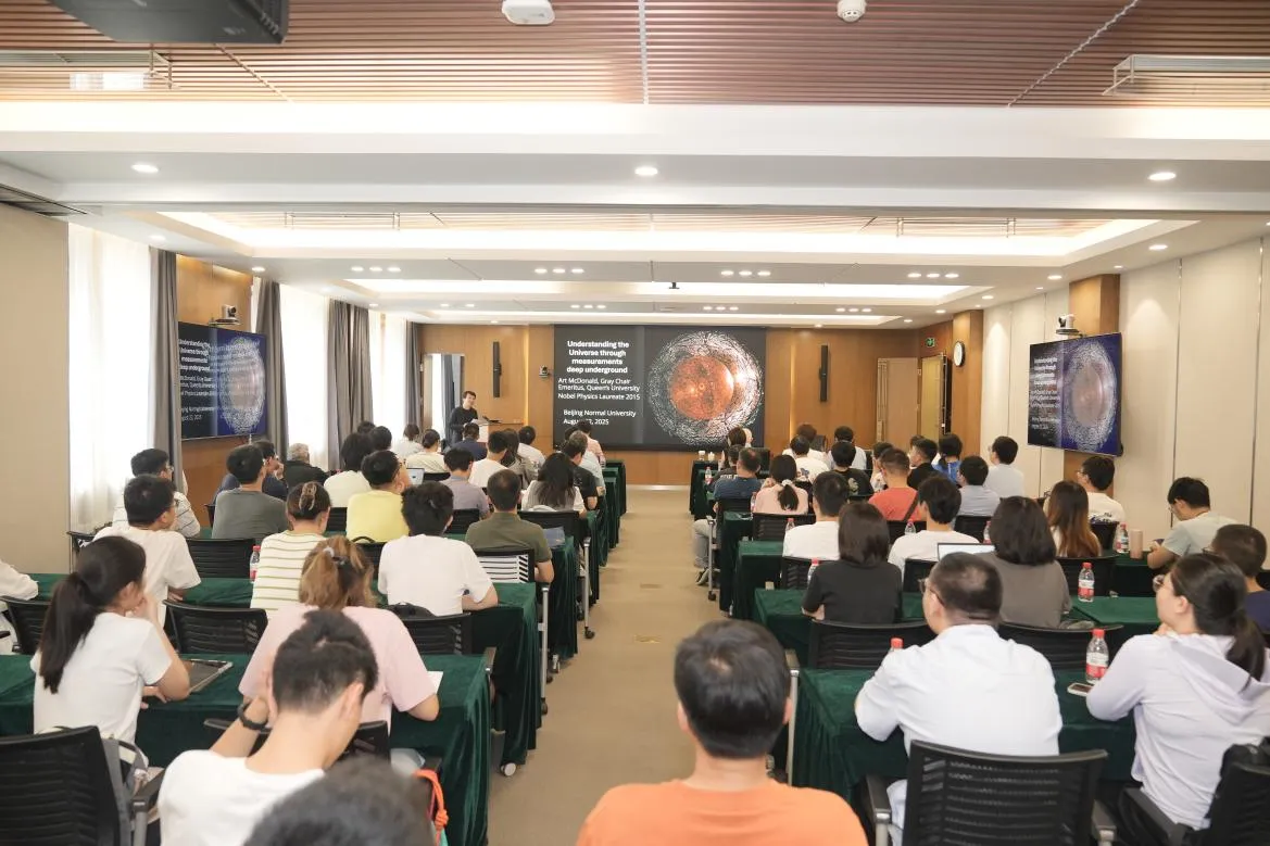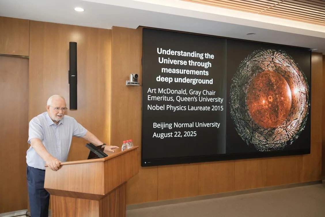 8月22日,“京师大讲堂”大师讲座在北京师范大学教三楼二层多功能厅举行。2015年诺贝尔物理学奖获得者、美国国家科学院外籍院士、英国皇家学会院士、加拿大皇家学会院士、加拿大女王大学教授Arthur B. McDonald作题为“Understanding the Universe through measurements deep underground”的主题报告。北京师范大学校长于吉红、副校长陈兴、科研院相关负责人、物理与天文学院相关负责人和百余名师生参加了此次报告会,陈兴主持会议。