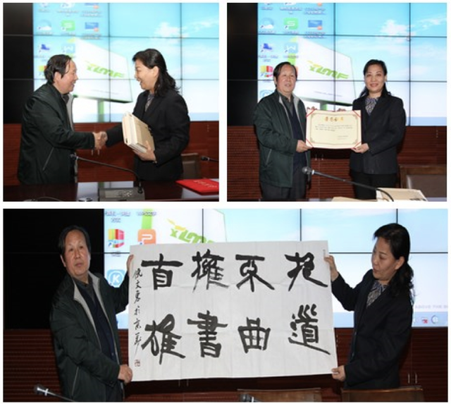讲座结束前,倪教授将自己的书法论著赠与图书馆,并专门为图书馆题写了五幅书法作品,图书馆分党委书记李晓娟代表图书馆致谢,并为倪文东教授颁发了捐赠证书。