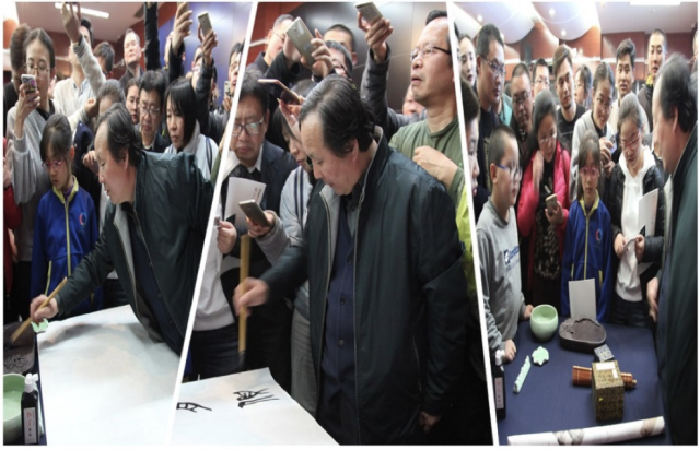 讲座结束后,大家意犹未尽,倪教授当场挥毫泼墨为大家示范,边写边讲解中国书法对内容形式和造型的讲究,对一幅作品章法布局、印章等每个环节的要求,现场观众纷纷感叹于倪教授的深厚笔力,同时对倪教授推广书法艺术和中华优秀传统文化的不懈努力表示敬佩,2018年图书馆首场专家讲座取得圆满成功。