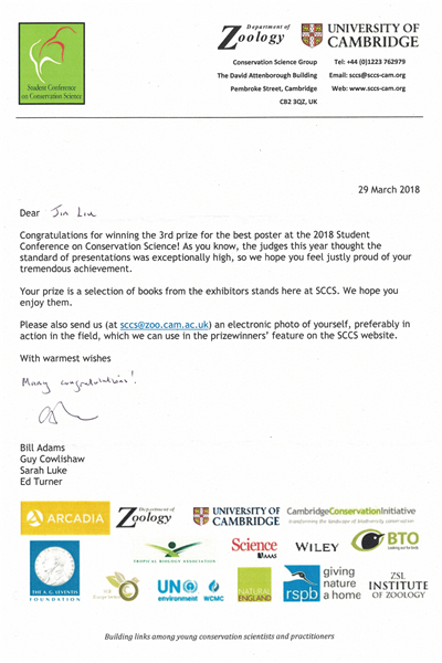 2018年3月27日至29日,在北师大双一流学科建设项目的资助下,我校生命科学学院的博士生刘金赴英国剑桥大学参加了“第十九届国际保护科学学生大会”(19th Student Conference on Conservation Science -- SCCS),并荣获最佳墙报第三名。