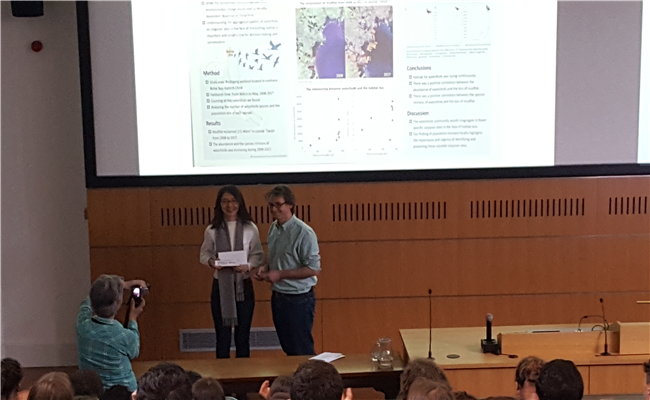 刘金同学现为生命科学学院生态学研究所一年级博士生,导师为张正旺教授。她在博士阶段主要从事滨海湿地水鸟多样性及其保护方面的研究,在本次会议上针对渤海湾迁徙水鸟近十年的种群动态及其与栖息地变化之间的关系进行了墙报展示。因其“清晰的研究问题、合理的方法与解释、连贯的叙事逻辑、美观的视觉设计以及所研究问题在保护科学、政策制定与管理上的重要贡献”,刘金同学的论文从一百多位代表的墙报中脱颖而出,位列第三名,受到了剑桥大学保护科学领域专家的高度评价和肯定,为北师大的生态学双一流学科建设增添了光彩。