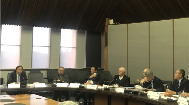 我校胡必亮教授在圆桌会议上发言(从左二开始,依次为王晓鲁、樊纲、Dwight Perkins、Peter Drysdale、黄益平、宋立刚)