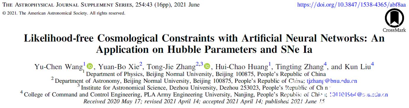 6月15日,北师大物理学系2017级本科生王彧辰和黄辉超等同学的研究论文“Likelihood-free Cosmological Constraints with Artificial Neural Networks: An Application on Hubble Parameters and SNe Ia, Yu-Chen Wang, Yuan-Bo Xie, Tong-Jie Zhang, Hui-Chao Huang et al.”在国际天体物理杂志The Astrophysical Journal Supplement Series (ApJS)上发表。