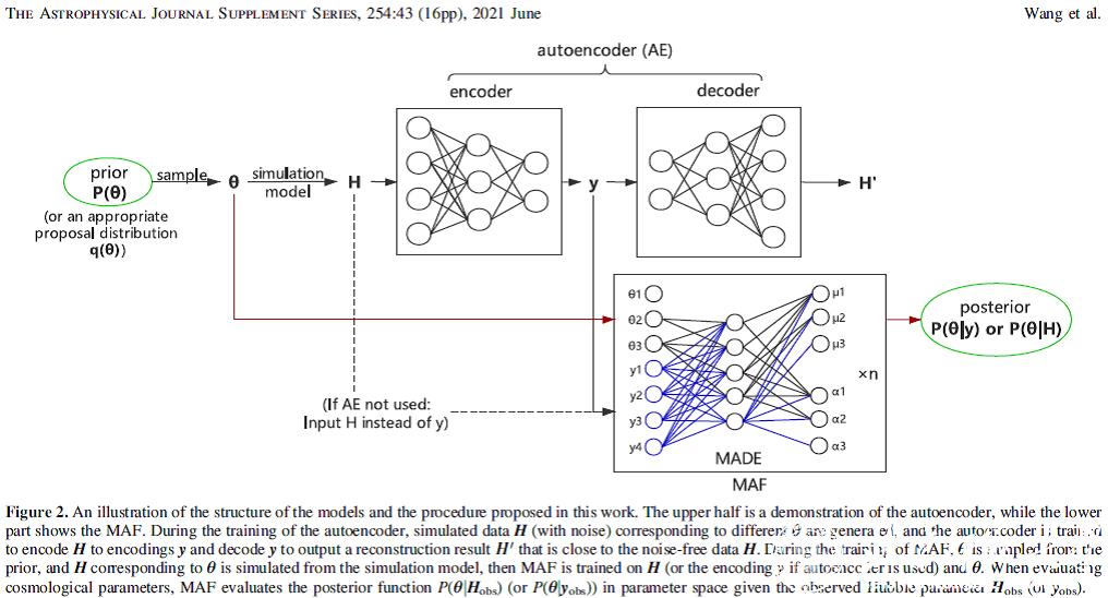 王彧辰等在论文中首次提出联合应用降噪自编码器(Denoising Autoencoder)和掩码自回归流(Masked Autoregressive Flow)两种神经网络实现数据降维和无似然(likelihood-free)宇宙学参数限制。论文采用王彧辰等提出的自编码器损失函数,首次指出在无似然限制中可用自编码器从数据中提取尽可能多的信息;随后用当前最先进的神经密度估计器之一,掩码自回归流,实现宇宙学参数的无似然限制,该方法和传统方法相比可更好地处理数据的分布。对于掩码自回归流的使用,首次指出其训练数据的参数分布选取对限制效果的影响,并据此提出一种顺序训练方法,减弱参数分布范围对结果的不利影响。用哈勃参量模拟数据进行的实验表明,论文中提出的新数据降维与参数限制流程可以达到能与传统方法相媲美的限制精度。论文还通过实验直接证明,首次提出的顺序训练方法和降噪自编码器降维方法可成功提高掩码自回归流的训练效果。论文将提出的方法应用于真实哈勃参量数据和Ia型超新星数据,得到了与传统方法相一致的参数限制结果。在论文中,王彧辰等还提出应用高斯过程改进现有哈勃参量模拟方法。经过比较说明,高斯过程比原有方法更接近数据的变化规律。提出对于Ia型超新星使用更原始的光变曲线参数进行宇宙学限制。该方法无需较多关于相关参数或模型的先验假设,对未来研究有重要的启发意义。