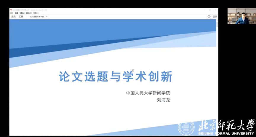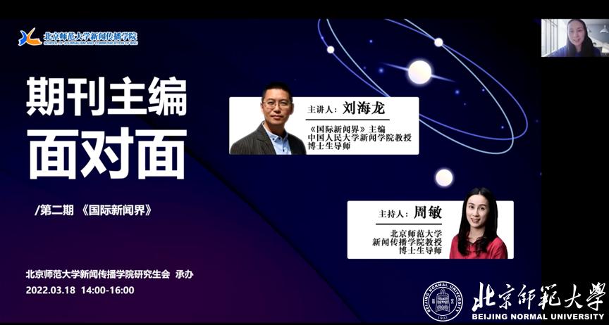 3月18日下午,北京师范大学新闻传播学院“期刊主编面对面”系列讲座第二期在云端举办。本期邀请到《国际新闻界》主编、教育部青年长江学者、中国人民大学新闻学院传播系主任刘海龙,他分享的题目是《论文选题与学术创新》。讲座由北京师范大学新闻传播学院教授周敏主持。