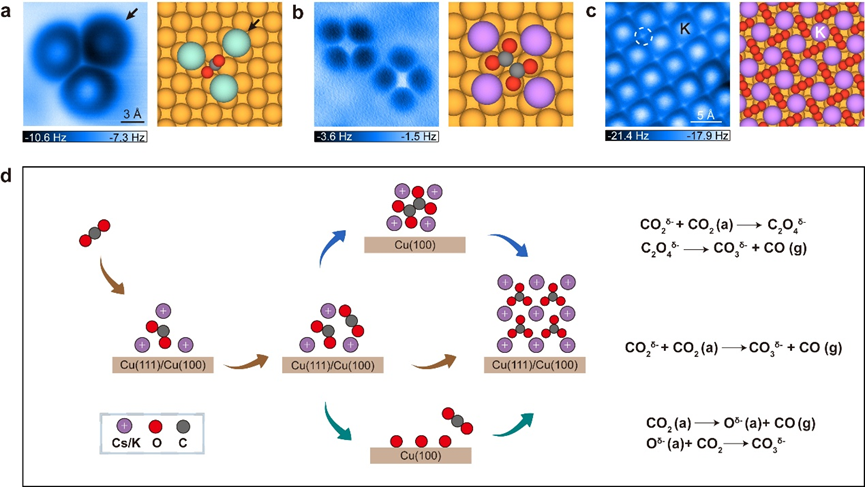 图1 铜表面上碱金属阳离子聚集诱导CO2的高效活化和转化。(a-c)碱金属离子与关键中间体配位结构(3Cs+∙CO2δ- (a), 4K+∙C2O42- (b), KCO3 (c))的高分辨AFM图和结构模型图;(d)反应机理示意图。