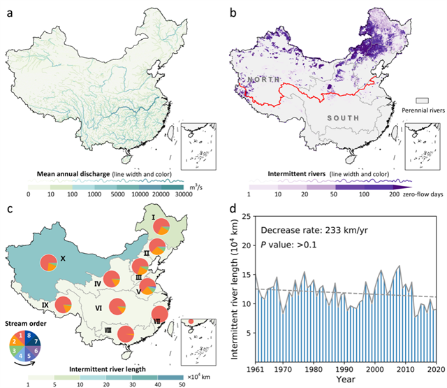 研究利用陆面模型结合河道汇流模型重建了我国过去60年约21万条河段高分辨率天然径流量,并进一步构建河流水文连通性量化指标,发现1961–2020年期间,间歇性河流长度约占我国所有河流总长度的13%,北部和南部地区之间存在极大差异。尽管我国过去60年河流间歇性呈不显著下降趋势,但气温升高通过减少地表可用水量部分抵消了该下降趋势,当去除长期温度趋势时,其下降趋势进一步增加了一倍。同时,去除降水长期趋势的模拟试验也证实了气温增加对流连通性的负向影响作用,未来需要持续关注暖干化气候区河流水文连通性。