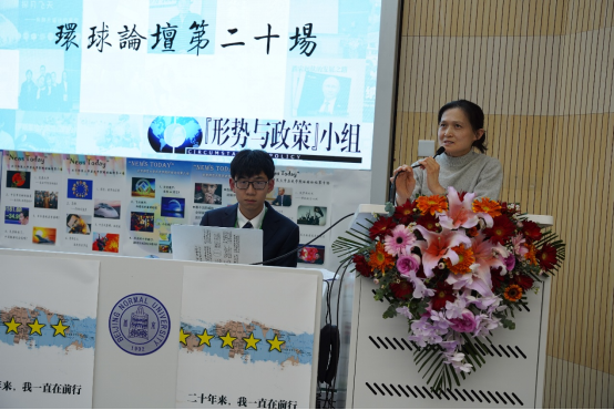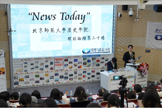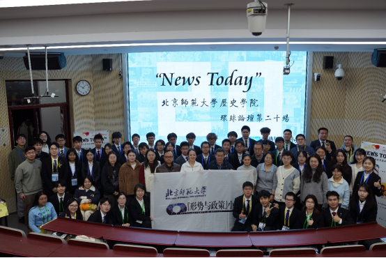 “News Today”北京师范大学历史学院环球论坛是历史学院依托“形势与政策”小组推出的一项特色精品活动,自2006年以来已连续举办二十场。活动中,学生自主选择感兴趣的国内国际时事话题进行分组主题展示,并邀请历史学院的教授学者进行专业点评。环球论坛拓宽了同学们的视野,培养了团队协作能力,也对外展示了北师大学生博古通今、胸怀天下的国际视野,在北师大乃至北京市高校范围内产生了广泛的影响。在论坛上表现出色的同学将有机会以“学生进课堂”的形式为全校本科生授课。十九年来,共有18个年级的同学先后54次登上讲台,受众已达数千人,为北京师范大学学生思想政治教育创新不断发挥积极作用。