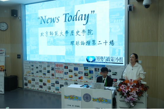 本次活动恰逢“News Today”北京师范大学历史学院环球论坛二十周年。活动伊始,主持人通过丰富的图片资料带领大家重温二十年来环球论坛的精彩难忘瞬间。活动中,“形势与政策”小组2025级新成员分为三组,围绕国际热点话题,结合历史与现实进行主题展示。