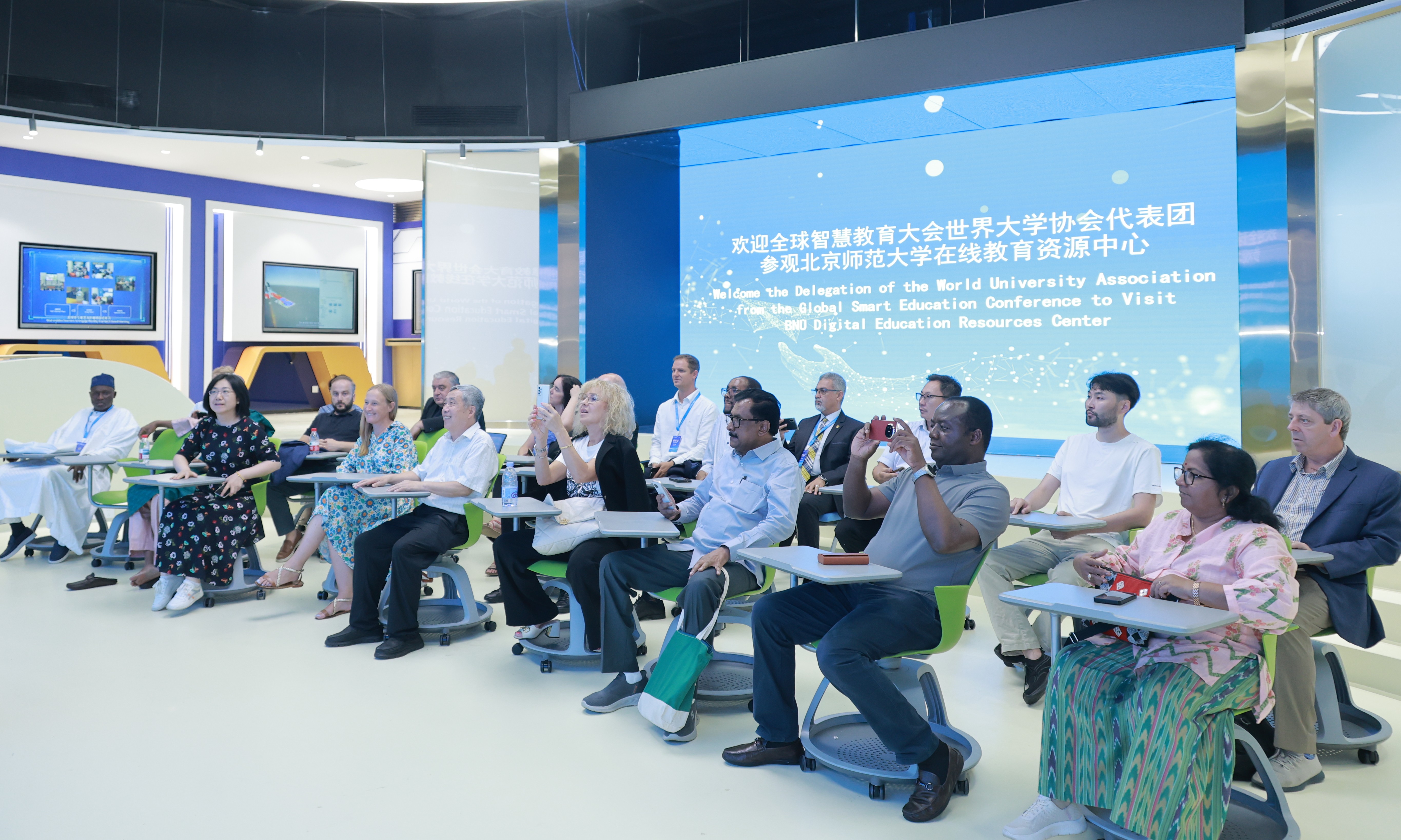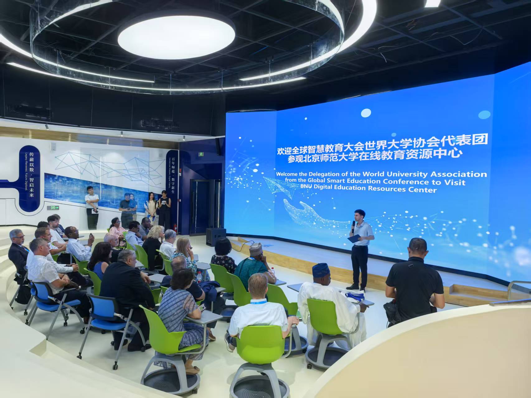 8月21日,出席全球智慧教育大会的世界大学协会代表团一行到访北京师范大学,对新近落成的北京师范大学在线教育资源中心开展了实地考察。这是中心建成之后首次迎接国际嘉宾,象征着北京师范大学在推动数字教育资源建设、深化国际教育交流合作方面迈出了新的一步。来自十六个国家的十八所高校的负责人来到北京师范大学演播楼,北京师范大学智慧学习研究院副院长陈光巨,教育技术学院院长马宁、党支部书记兼中心主任赵国庆、中心副主任姚自明参加考察。