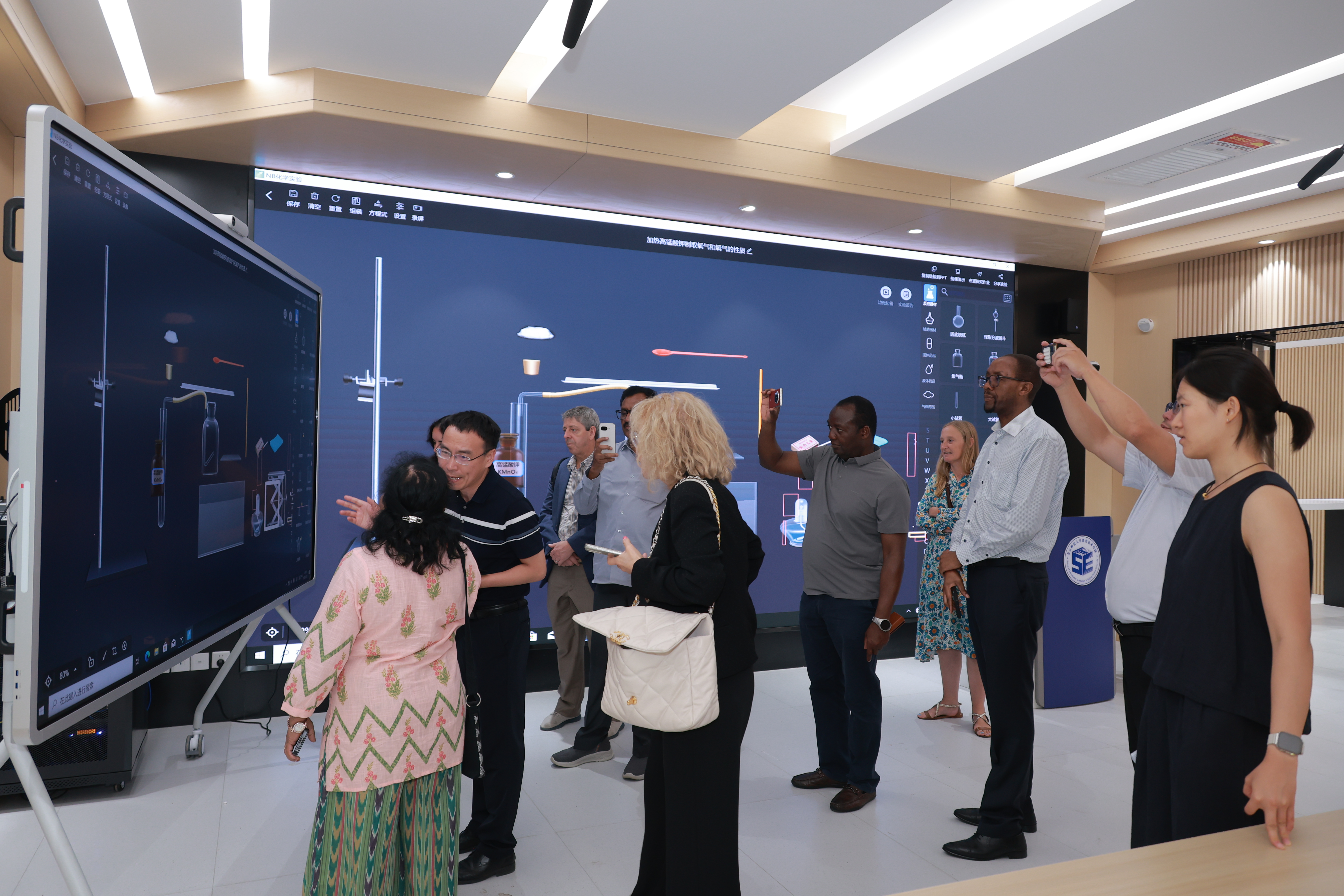 代表团成员参观了中心的九大功能区,观看了首批展示的15个数字教育资源,并着重体验了智慧教室、虚拟仿真等相关资源。