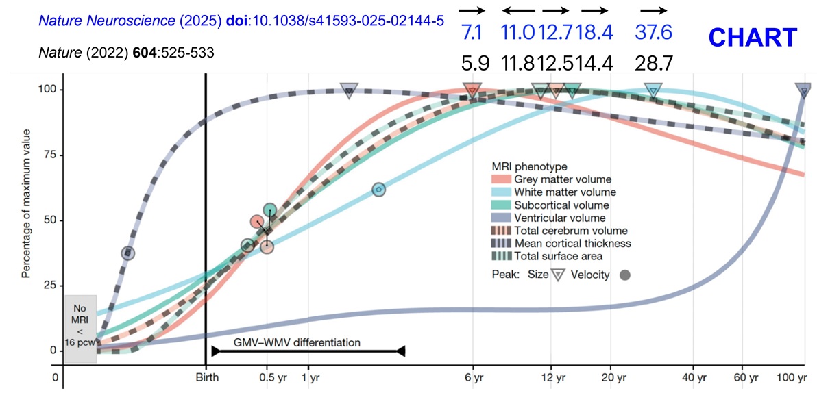 长期以来,全球脑科学研究与临床评估所依赖的脑结构常模主要基于欧美人群数据。然而,越来越多的证据表明,不同人群因进化遗传、环境等因素,脑结构与发育轨迹存在差异。直接使用“欧美标准”来评估中国人群脑健康,可能导致偏差或误判。此项研究填补了这一关键空白。通过对24061名健康中国人脑磁共振影像的分析,CHART团队刻画了覆盖脑网络组、人类连接组计划脑分区和人脑高精功能连接分区等图谱、包括灰质、白质体积、皮层厚度、脑表面积等在内的228个脑形态指标随年龄变化的“标准生长曲线”。研究发现,中国人脑多个结构形态的发育峰值年龄(里程碑)晚于欧美人群:例如(图1)皮层灰质体积峰值出现在约7.1岁,晚于欧美常模的5.9岁;白质体积峰值出现在约37.6岁,比欧美常模28.7岁晚了近8.9年。这表明,中国人脑成熟与老化进程具有自身特点,确立本土化的评估基准至关重要。