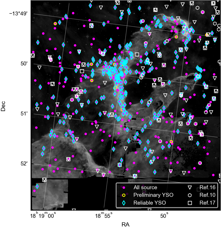 其中,青色菱形点代表了253个可靠的年轻恒星体候选者;黄色圆圈点则为需要进一步确认的初步候选体。作为对比,图中的白色符号标记了此前研究在该区域发现的少量年轻恒星,其数量远少于本次发现。这张图像清晰地显示,大量新发现的年轻恒星体候选者(图2中以青色菱形点标示)并非随机散布,而是高度密集地排列在“创生之柱”的轮廓边缘。这种如同被“勾勒”出来的空间分布模式,与恒星反馈压缩星云物质并触发新恒星诞生的理论预测相吻合。本图摘自发表论文中图1。
