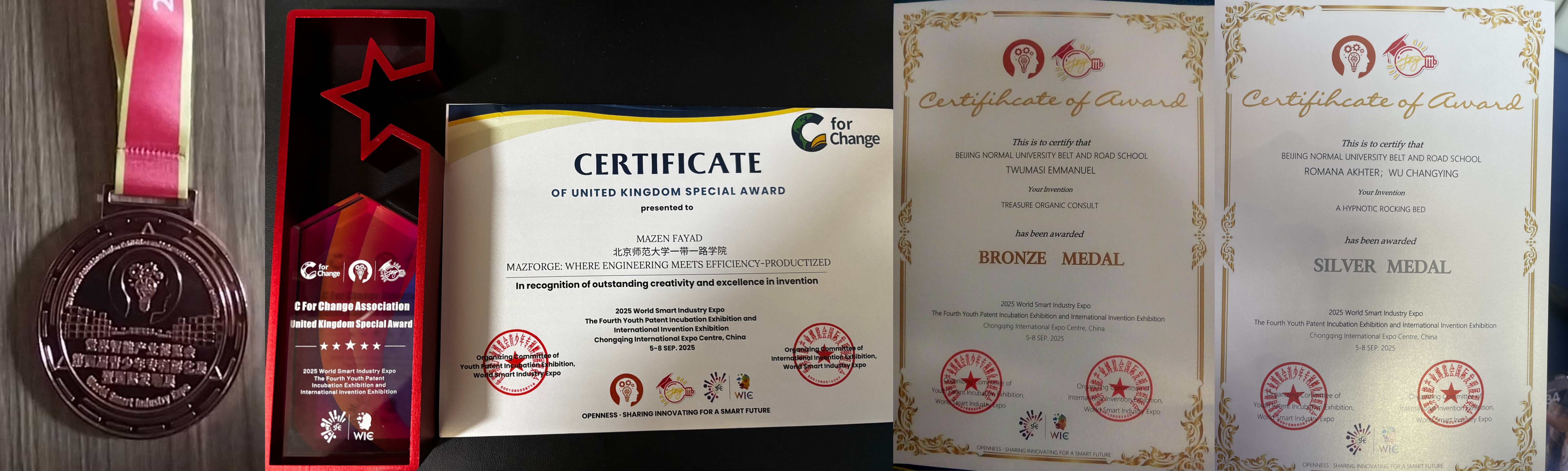 来自意大利的北京师范大学一带一路学院教授蓬佩奥・德拉・波斯塔和学院中来自黎巴嫩、孟加拉国、加纳等地的MBA项目留学生们受邀参加了此次博览会。在同期举办的第四届青少年专利孵化展暨国际发明展上,学院师生展现出了卓越的创新能力和专业素养,为共建“一带一路”倡议下的国际合作增添了光彩。留学生们凭借出色的创新产品和创意,荣获银奖、铜奖与“英国特别奖”(United Kingdom Special Award)荣誉。这些项目不仅是留学生个人创新能力的体现,而且是学院在创新人才培养方面的重要成果。