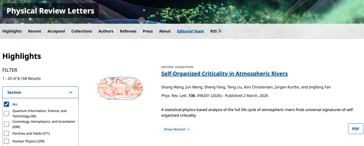 本研究为大气河建立了一个统计物理意义上的统一理论框架,首次在地球水汽输运系统中系统验证了自组织临界统计结构。该成果:将非平衡相变理论拓展至气候系统尺度;将雪崩动力学与分形标度理论引入水循环研究;将复杂系统临界理论应用于极端水文气候事件形成机制。这一工作不仅深化了对大气河物理本质的理解,也为极端事件预测、气候风险评估与防灾减灾提供了新的理论支撑。论文被PRL选为Editors’ Suggestion,代表该成果在国际物理学界具有重要理论意义与广泛学术影响。