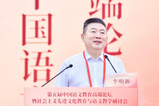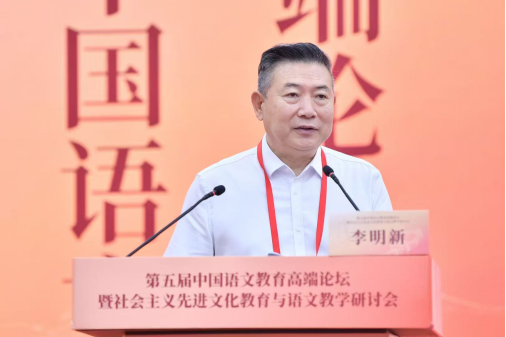 李明新在致辞中强调,本届论坛聚焦社会主义先进文化教育,对落实教育强国建设具有重要意义。他指出,语文教育兼具工具性与人文性,肩负着以文化人、培根铸魂的使命。为推动语文教育更好服务于教育强国建设,他提出五点要求:高扬爱国主义主旋律;统筹社会主义先进文化与中华优秀传统文化、革命文化教育;准确把握新课标对先进文化的呈现;创新数字化时代的阅读教学;促进语文与思政、历史等学科融合。最后,他号召语文教育工作者要勇担使命,为社会主义现代化强国建设提供不竭精神动力。