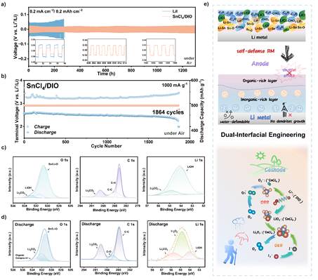 该策略使锂空气电池在无需控湿的潮湿空气环境中(RH=50%~55%),于1000 mA g⁻¹高电流密度下实现了1864次(超过2160小时)的超长循环寿命,显著拓宽了其实际应用的环境适应性。该研究为解决长期制约锂金属空气电池实际应用的环境湿度问题,提供了创新且高效的解决方案,为设计下一代高能量、高环境耐受性的金属空气电池系统指明了新方向。