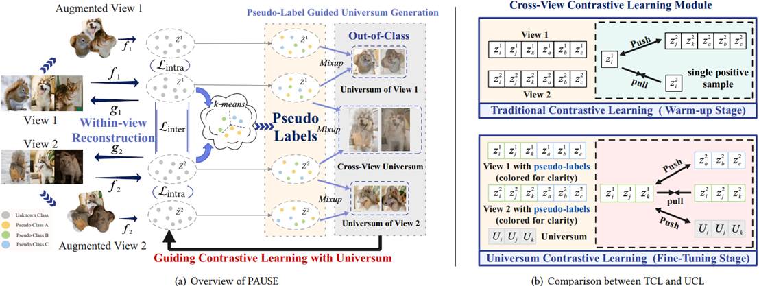 针对上述问题,余先川课题组提出了一种新颖的伪标签引导的普适学习(PAUSE)框架,用于稳健的多视图聚类。PAUSE在两个协同阶段运行:一个预热阶段,采用双重对比学习来生成可靠的伪标签,从而建立稳健的语义关系;一个微调阶段,通过在锚点实例和类外质心之间进行Mixup来合成普适样本,并由获得的伪标签引导。这种独特的机制构建了广义的负类,扩大了类间间隔,同时保持了类内凝聚力。至关重要的是,扩大的决策边界可以防止错位类内实例的错误分类,从而有效避免了FNP,而无需显式的负对校正。本项研究进一步设计了一种稳健的普适对比损失,通过自适应边界约束显式地强调跨视图一致性。