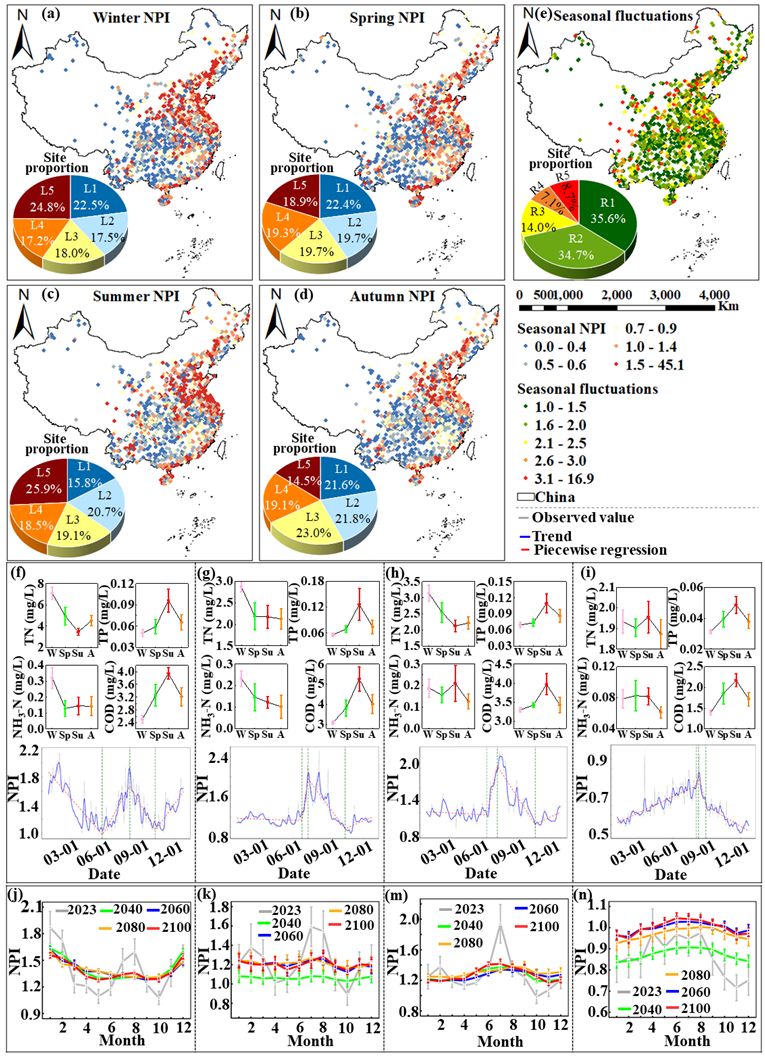 研究发现,当前中国河流营养盐污染呈现冬夏双峰型特征,夏季污染最严重,占高峰站点的42.6%,冬季次之,占30.3%。然而在高排放情景(SSP5-8.5)下,到2100年,春季和秋季的污染将分别上升12.6%至20.1%和19.7%至28.3%,而夏季污染反而下降14.8%至27.0%。与此同时,季节性波动显著减弱,月度变异系数从当前的0.1降至0.01至0.02。这意味着传统的“夏季治污窗口”将逐渐失效,污染高峰将转向春秋两季。这种转变与气候变暖导致的降雨模式改变和温度季节迁移密切相关。