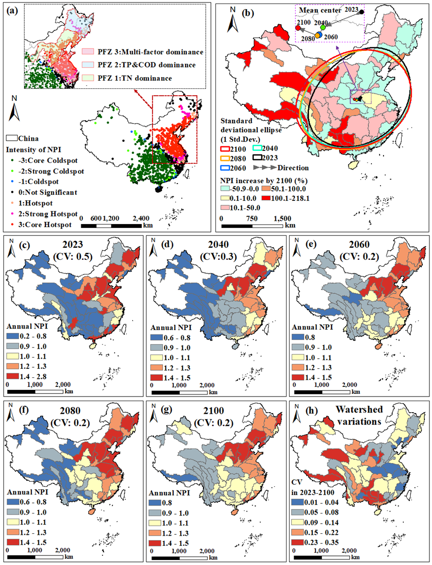 基于时间变化模式及空间分析,研究团队将全国划分为三个“热点过程功能区(PFZ)”和一个“冷点区”。其中,华北平原和辽河流域等属于PFZ-1,以氮污染为主导;松花江流域属于PFZ-2,以磷与有机污染为主导;淮河、长江下游和珠江上游属于PFZ-3,表现为多污染物复合污染;而青藏高原边缘和云贵高原等地区目前污染极低,被归为冷点区。令人关注的是,到2100年,污染中心将向西南方向迁移。冷点区的营养盐污染指数中位数增长超过70%,局部地区甚至超过200%。空间变异系数从0.5降至0.2,表明不同区域之间的污染差距正在缩小,污染格局趋于均质化。而这些冷点地区恰恰是人口密度低、GDP低、基础设施薄弱的生态脆弱区,其适应能力非常有限。尽管绝对污染水平仍低于东部热点区,但相对变化如此剧烈,意味着这些区域的生态缓冲能力正在丧失,环境不公平问题正在加剧。